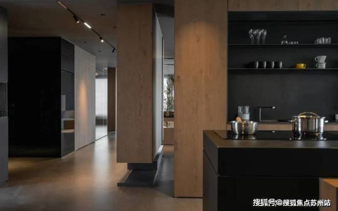 围绕着岛台餐桌的西厨区,不但可以直接欣赏到从客厅延展而来的江景,书房墙体和柜体之间留出一部分距离,也能窥见玻璃植物房的景观。