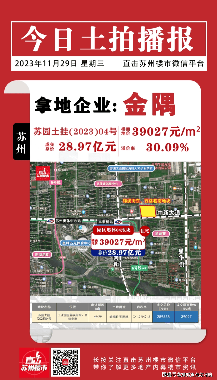 紫金·翡丽甲第,原为金隅保利奥体04地块,该地块于2023年11月29日(苏州第八批次土拍)拍出,这也是苏州取消土地限价后的首场土拍。当时地块吸引十几家房企报名、竞价120轮!最终金隅拿地,成交楼面地价39027元/㎡,远超预期!