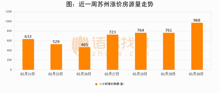 根据诸葛找房数据显示,苏州24小时涨价房源量为968套,较05月29日增加207套,环比上涨27.2%。与此同时,涨价房源占比小幅扩大,业主信心有所提升。
