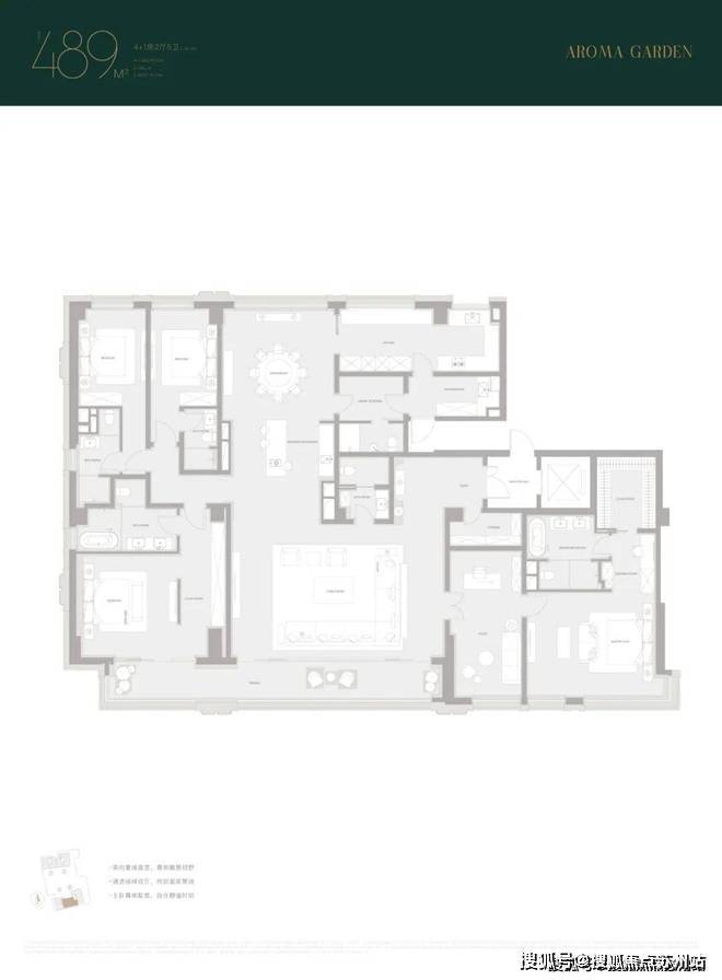 露香园·天誉约489㎡的整体面宽是4个产品中最宽的,达到了约26米,比另外三个产品多了4米左右,相当于多出了一个开间,另外三个指标性项目互有来回,包含玄关空间尺度、厨房空间尺度、次卧面积尺度,整体是一个以大面宽为核心竞争力,较为均衡的产品。