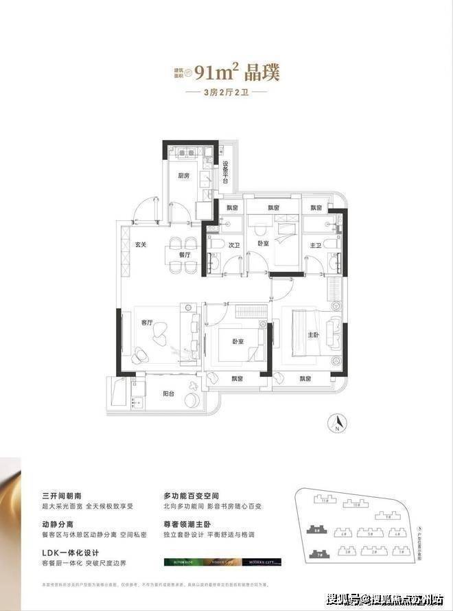 建面约91㎡三房户型图▼上海奉贤右岸晶邸售楼处电话☎:400-8828-814(售楼处预约看房热线)