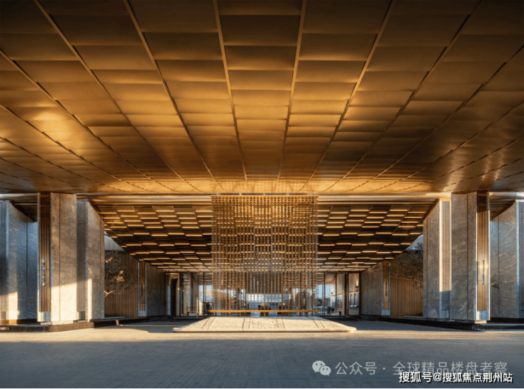 在凤起潮鸣,归家,即是一场艺术巡礼。项目主入口“凤起冕旒”,以现代建筑语汇转译古代帝王冠冕的仪制,85米长的门廊运用奢石、金属与6045颗手工景泰蓝旒珠,塑造出强烈的第一眼尊崇。