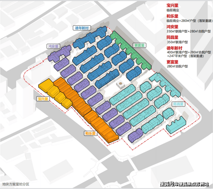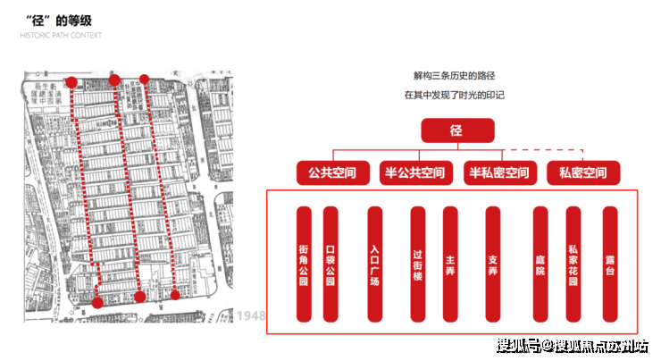 另外,从组团上看,分为历史保护组团、内部组团、沿街组团: