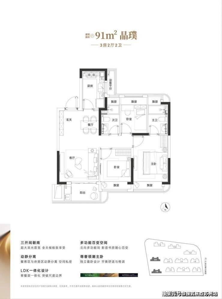建面约91㎡做3房2卫,三开间朝南、3房5飘窗1阳台,整体室内的采光、视野以及通风都相当出彩。动静分离+主卧套房的设计,保证了整体居住的安静和私密性。