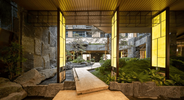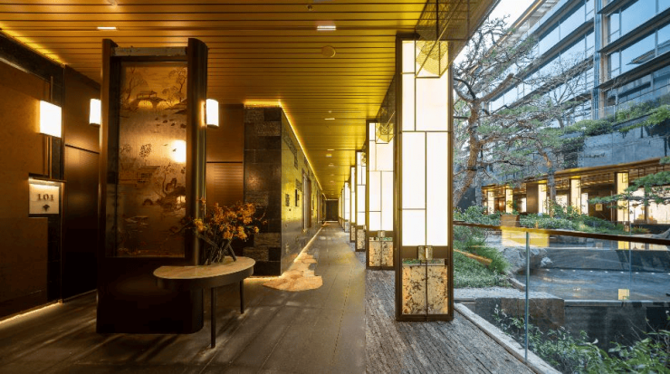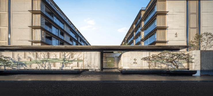 主入口横向延展面达90M,门头采用庑殿形制,以大规格金色金属对称式屋顶,强化归家礼序,立面以透光碧玉奢石呼应“天青”之美,结合星空闪耀的流水景墙,打造“光之水韵”,共同还原古运河形态;中轴景观以“引水入园、枕水而居”为核心理念,引入一条运河入园、联通整个中心轴线,从西而动,打造一轴四处运河之源的场景;在入口位置结合下沉庭院打造会所、健身、泳池、私宴等配套功能,形成多维立体的共享空间。