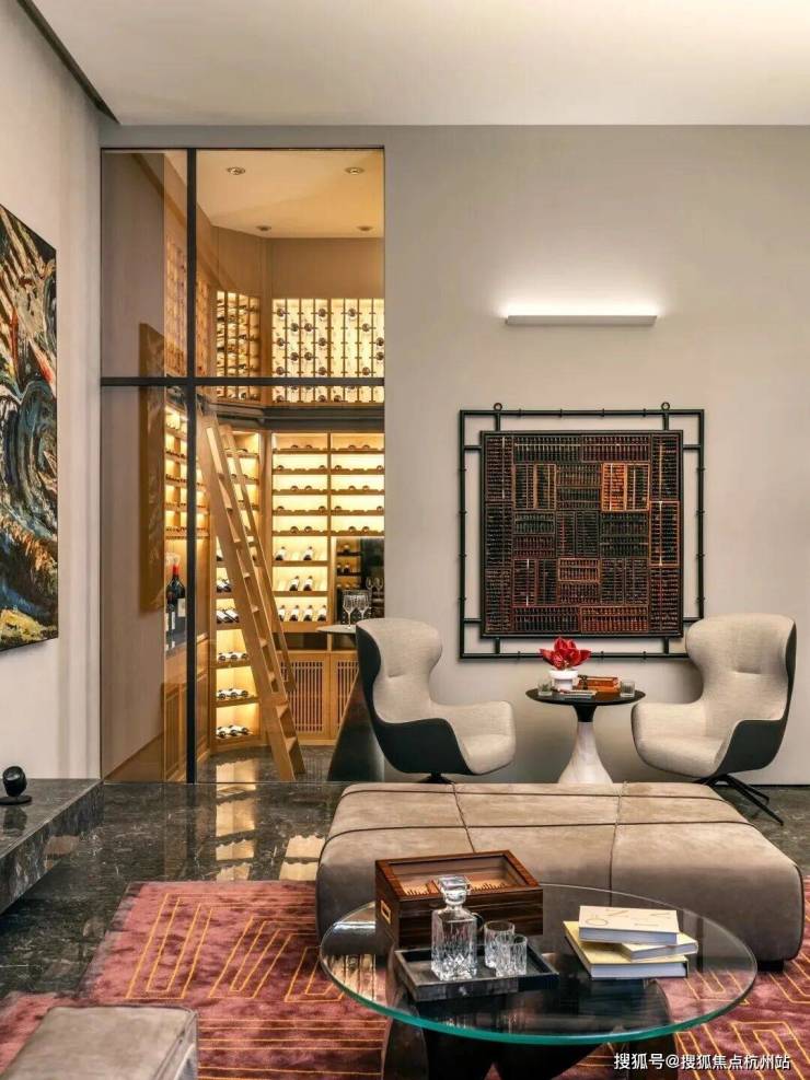 在对角,我们开辟了一面落地窗展示酒窖,展现主人的收藏。温暖的酒窖灯光和壁炉光线映照在白橡木酒架上,为客厅带来温暖舒适的氛围