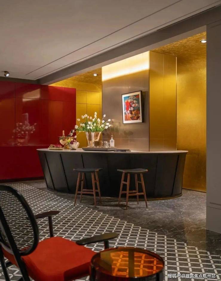 在“木屋”后方,是一个墙面和天花板都覆盖金箔的“水吧”。在这里,我们重新引入了一些当代西方设计语言——大理石地面图案、蛋形吧台和墙面护板细节。这些元素与醒目的红色高光烤漆柜相互平衡。