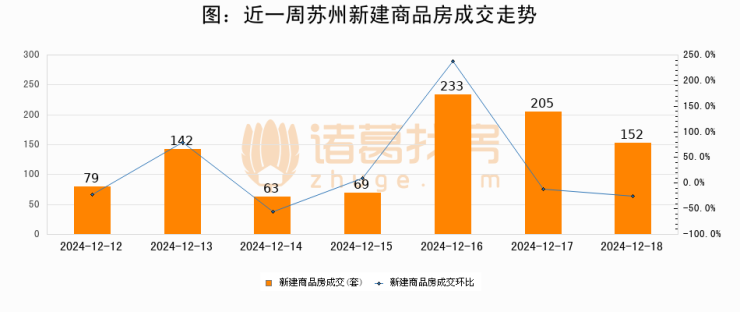 根据苏州市房地产市场和交易管理中心数据显示,2024年12月18日苏州新建商品房成交152套,较昨日减少53套,环比下降25.9%。近一周苏州新建商品房日均成交135套。12月18日单日成交152套,高于近一周平均水平12.6%。
