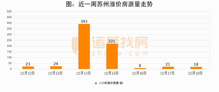 根据诸葛找房数据显示,苏州24小时涨价房源量为18套,较12月17日减少3套,环比下降14.3%。与此同时,涨价房源占比小幅回落,对于购房者来说是一个入市窗口期,购房者可抓住时机入市。