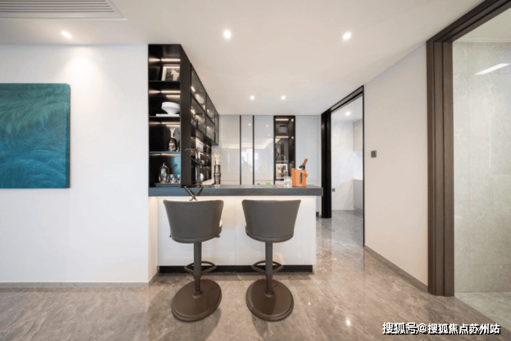 公区中,U型厨房空间足有约20㎡,还预留出了岛台和收纳柜的位置,满足高阶人士中西不同风味的烹饪需求。