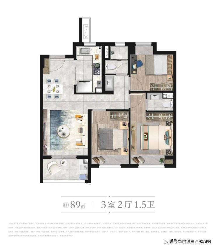 [ B户型 ] 建筑面积约89㎡ | 3房2厅1.5卫