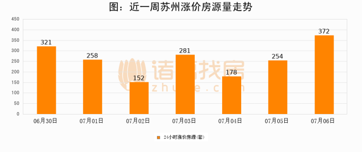 根据诸葛找房数据显示,苏州24小时涨价房源量为372套,较07月05日增加118套,环比上涨46.5%。与此同时,涨价房源占比小幅扩大,业主信心有所提升。