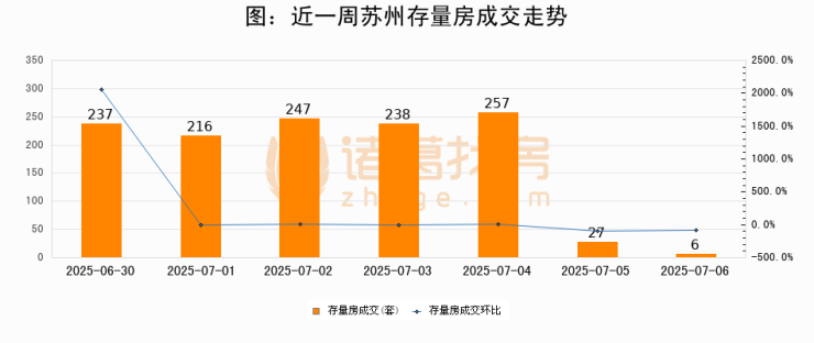 从存量房来看,2025年07月06日苏州存量房单日成交6套,比昨日减少21套,环比下降77.8%。从近一周存量房成交来看,苏州存量房日均成交套数为175套,07月06日单日成交6套,低于近一周平均水平96.6%。