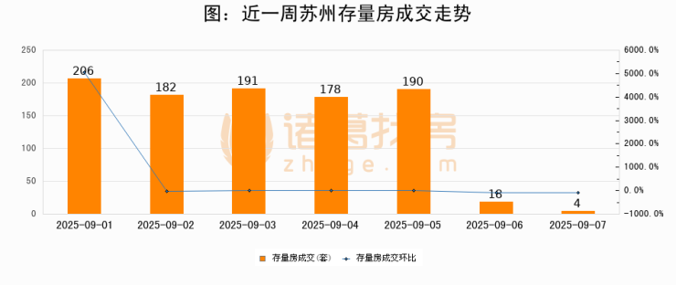 从存量房来看,2025年09月07日苏州存量房单日成交4套,比昨日减少14套,环比下降77.8%。从近一周存量房成交来看,苏州存量房日均成交套数为138套,09月07日单日成交4套,低于近一周平均水平97.1%。