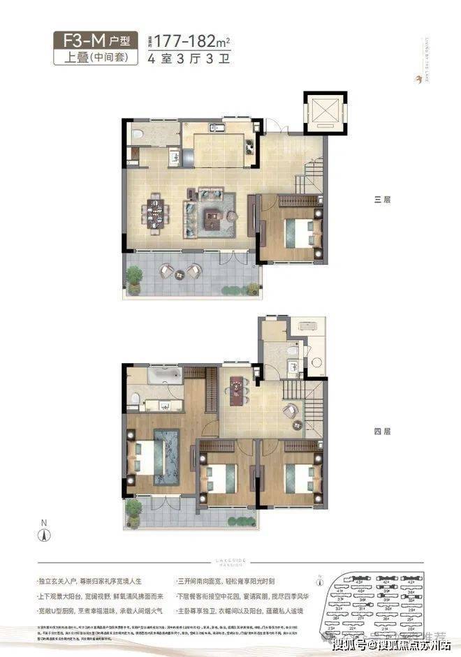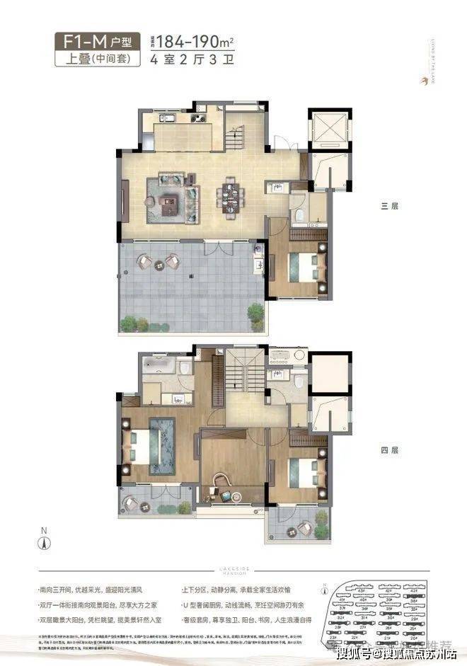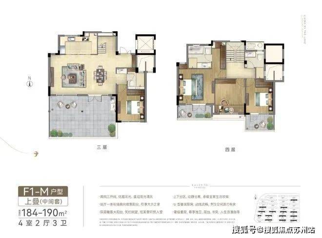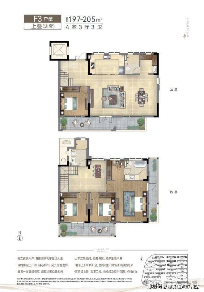 春风湖滨上叠的空间格局设计,来自对生活哲学的深刻理解。建筑面积约188㎡的上叠样板房,分三楼与四楼双层空间,整体采取了四房两厅三卫的设计,上下分区,实现生活场景的动静分离:餐客厅等社交娱乐空间均设在三层,四层则是卧室、书房等静谧空间,娱乐与休息互不干扰,为家人提供了更高品质的居住体验。