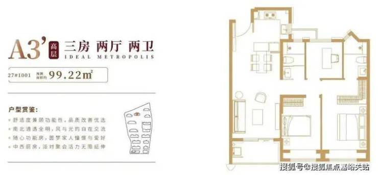 具体细节方面,项目目前只有一个建面约100㎡三房的样板间,带软装后面宽约3.3米,吊顶后层高约2.73米.