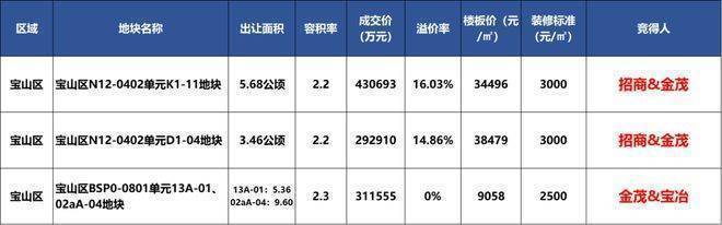 宝山淞南K1-11地块,由金茂&招商竞得,成交总价43.07亿元,溢价率16.03%;