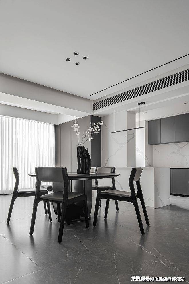 餐厅与厨房的融合呈现出一种和谐的氛围,采用内嵌式的储物柜和开放式的厨房设计,使整个空间流畅自然,宽敞明亮。在用餐时,透过落地窗,尽情沉醉于窗外的美景之中,仿佛是与自然对话的一种享受。
