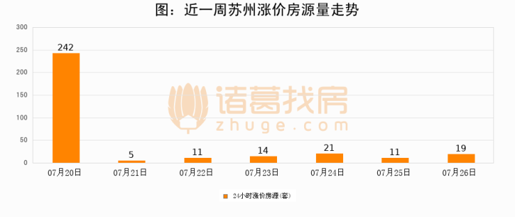 根据诸葛找房数据显示,苏州24小时涨价房源量为19套,较07月25日增加8套,环比上涨72.7%。与此同时,涨价房源占比小幅扩大,业主信心有所提升。