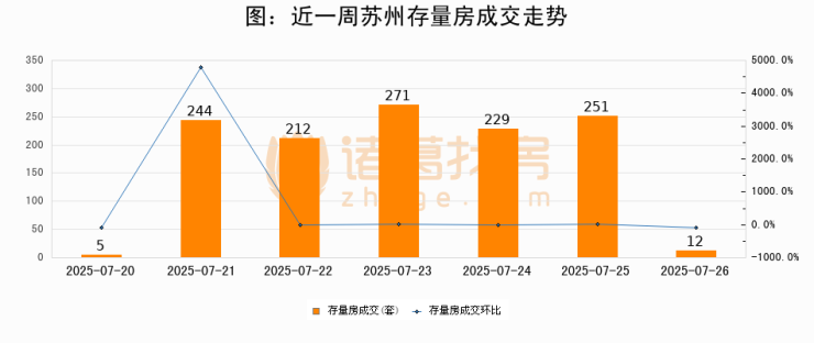 从存量房来看,2025年07月26日苏州存量房单日成交12套,比昨日减少239套,环比下降95.2%。从近一周存量房成交来看,苏州存量房日均成交套数为174套,07月26日单日成交12套,低于近一周平均水平93.1%。