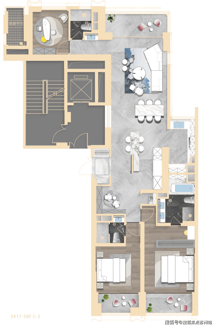 其中3#为超高层,北向可观小区绿化和苏河景观,高区可瞰三件套盛景。