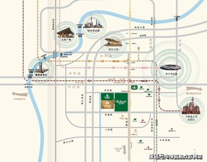 并且凭借区域内的 中环线、S20 、11 号线等道路交通设施。把康桥和前滩、张江科学城、迪土尼、浦东国际空港、外高桥自由贸易区等五大引擎连成一条黄金轴线。