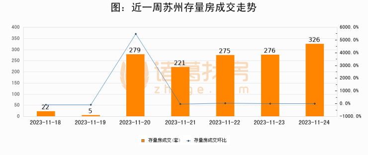 从存量房来看,2023年11月24日苏州存量房单日成交326套,比昨日增加50套,环比上涨18.1%。从近一周存量房成交来看,苏州存量房日均成交套数为200套,11月24日单日成交326套,高于近一周平均水平63%。