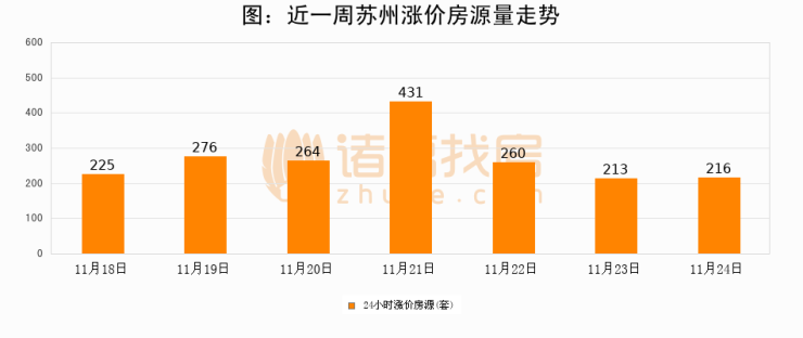 根据诸葛找房数据显示,苏州24小时涨价房源量为216套,较11月23日增加3套,环比上涨1.4%。与此同时,涨价房源占比小幅扩大,业主信心有所提升。