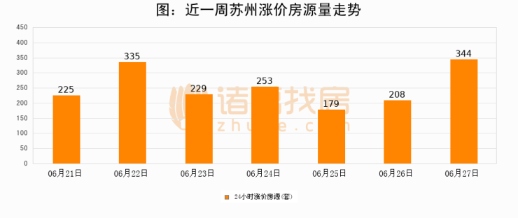 根据诸葛找房数据显示,苏州24小时涨价房源量为344套,较06月26日增加136套,环比上涨65.4%。与此同时,涨价房源占比小幅扩大,业主信心有所提升。