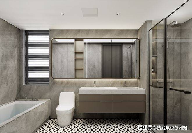 卫生间里的弧形镜、地面拼花、金属复古移门...各个空间都呈现出细节的精致感