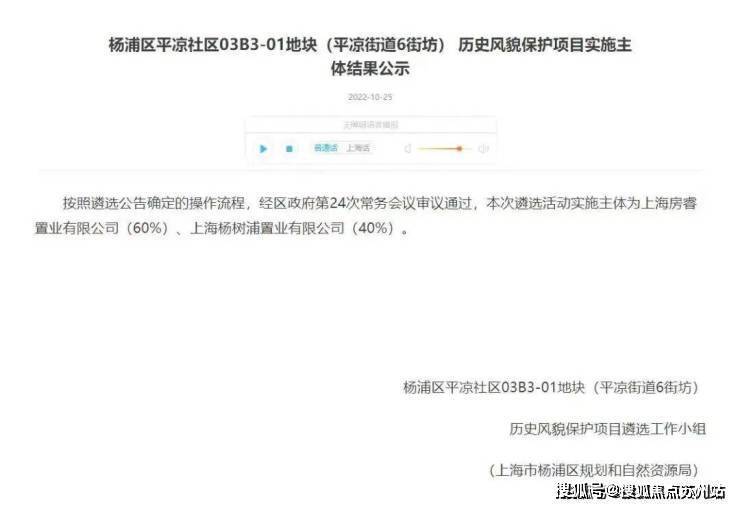 2022年10月25日,杨浦区人民政府官网发布公告,杨浦区平凉社区03B3-01地块(平凉街道6街坊)历史风貌保护项目实施主体结果公示:“本次遴选活动实施主体为上海房睿职业有限公司(60%)、上海杨树浦置业有限公司(40%)。”