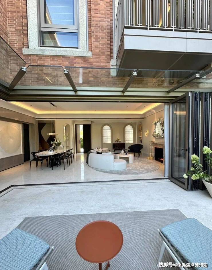 「无界空间」:客厅270度转角无柱设计,搭配落地玻璃,开阔视野将院中风景迎入日常。