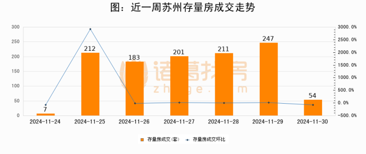 从存量房来看,2024年11月30日苏州存量房单日成交54套,比昨日减少193套,环比下降78.1%。从近一周存量房成交来看,苏州存量房日均成交套数为159套,11月30日单日成交54套,低于近一周平均水平66%。