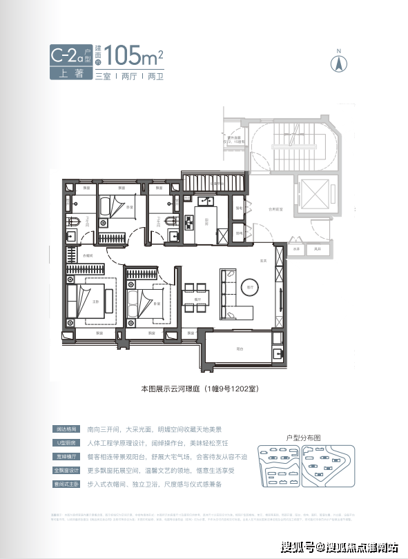 云河璟庭4#南向对望半岛公园,东边套可赏中庭景观;建面约129㎡四开间南向户型和建面约105㎡大面宽客厅户型,可同时观河景、揽园.
