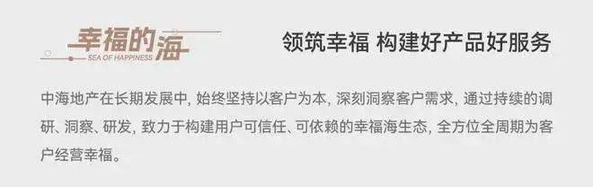 中海地产在长期发展中,始终坚持以客户为本,深刻洞察客户需求,通过持续的调研、洞察、研发,致力于构建用户可信任、可依赖的幸福海生态,全方位全周期为客户经营幸福。