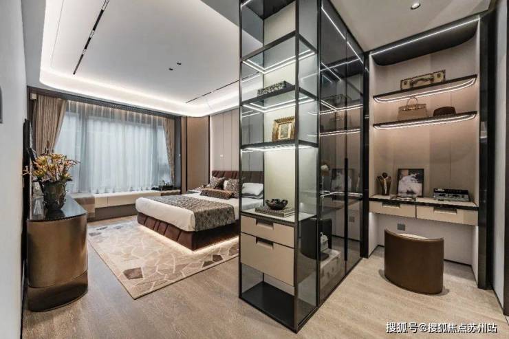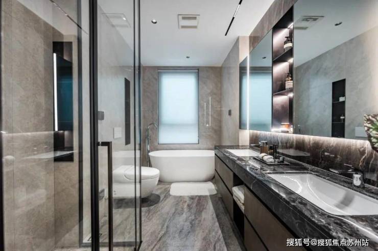 主卧内设置了通顶衣柜与化妆区域,卫生间选用品牌劳芬、当代的产品,配置有双台盆、大浴缸、淋浴设施、马桶以及美妆冰箱。