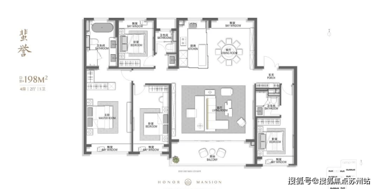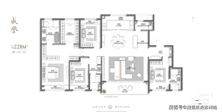 建面约 228㎡的洋房,南向总面宽达约 21 米,配备约 7.1 米阔景阳台,打造出双套房、双衣帽间、双玄关、主卧采用双开门设计、中西双厨的“五双”户型,而且双套房布局实现了全明三卫。