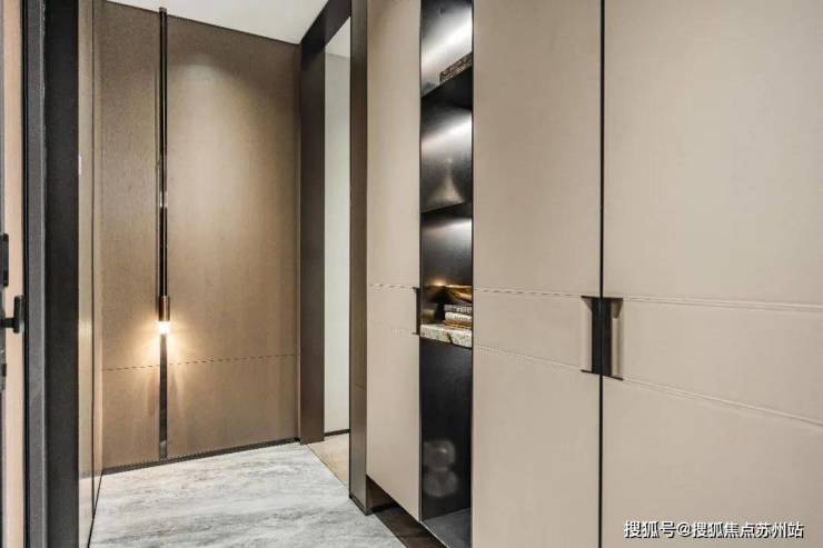 建面约 198㎡实景的细节呈现如下:采用内外双玄关布局,入户处设有独立储藏柜,客厅配置多组柜体,餐厅配备红酒柜,这些均属于交付标准内容。