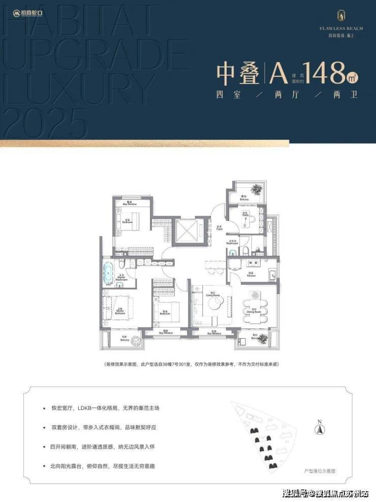 本宣传资料所涉及的户型仅供示意参考。仅为横拟本户型装修效果叠加装修设想进行展示、所示室内装修、家具、陈设、灯具、门窗等除注明外均不在交房范围之中;相同户型因楼栋楼展、单元等差别,局部结构、面积、功能布局、空间分制、门窗/管井形态位置等可能有不同,并且强弱电箱、插座位置等均未在户型围中体现,具体以政府部门及终审定的图纸和《商品房买卖合同》为准,本广告制作日期为2025年5月20日,有效期至2025年6月20日。开发商:上海招宜置业有限公司,推广名:招商臻境。