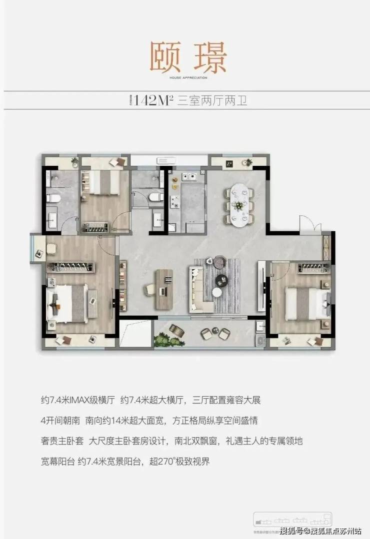 户型点评:两条天然河道从中建颐璟臺北侧和西侧蜿蜒流过,而140平这个户型最大的特点就是增加西侧开窗设计,整个房型三面采光,不但提升房间采光通风,更能完美拥有西侧北侧双河视野,一线河景尽收眼底;同时,约7.4米的大尺度横厅,除了拥有更大的采光面外,也可以根据需求自主隔离功能房空间。