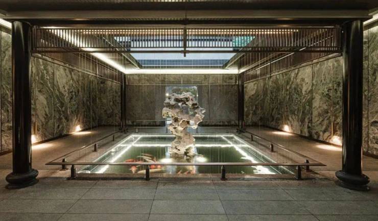 采用了四水归堂,水聚天心的空间设计理念,展现开合有序的空间变化,将光、风、雨、雪等自然元素融纳其中,当身处院内,与自然的对话也在这四方院内悄然发生,将中式韵味表达的淋漓尽致,给业主们带来富有仪式感的归家体验。