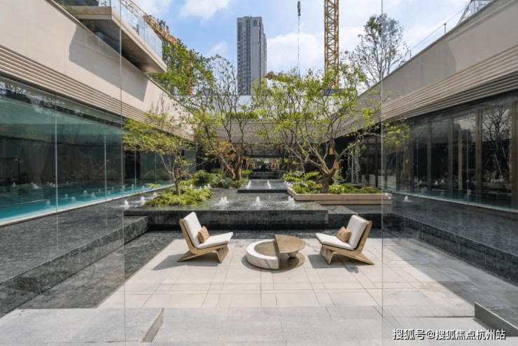 最后来看泳池。云邸玖章做了再升级。改为采用大尺度的落地玻璃拼接,约2.4米宽巨幅玻璃,且通过精致的玻璃交接细节处理增进室内外空间的融合,强调泳池的无界感,真正实现了无边泳池的效果、质的飞跃。