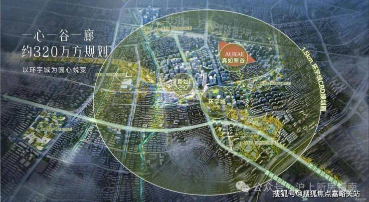 以环宇城为圆心蜕变1.5km圈,围绕“一心一谷一廊”规划。一心-真如之心、一廊-真如绿廊、一谷-真如翠谷。