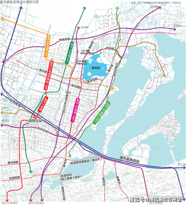 在轨道交通方面,在建中的轨道 交通2号线北延线,经过高铁新城可达盛泽湖西南侧,还有规划中的 10、13、16号线都将穿越盛泽湖周围。