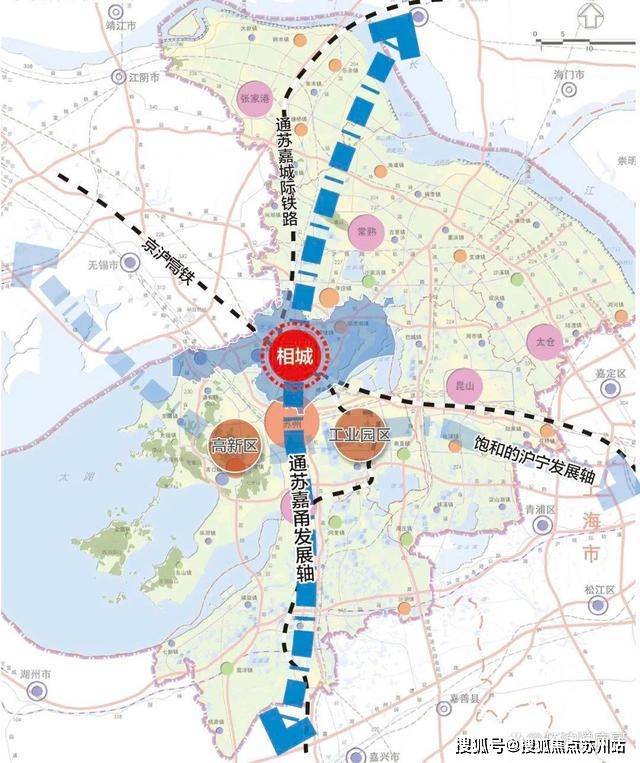 从苏州城市发展脉络来看,过去二十多年,苏州主要以东西沪宁发展轴为城市主动脉而发展, 从而成就了金鸡湖和独墅湖为主导的园区双湖板块,而今东西轴线已处于饱和状态, 苏州接下来的发展重点正向南北向的通苏嘉甬发展轴拓展。