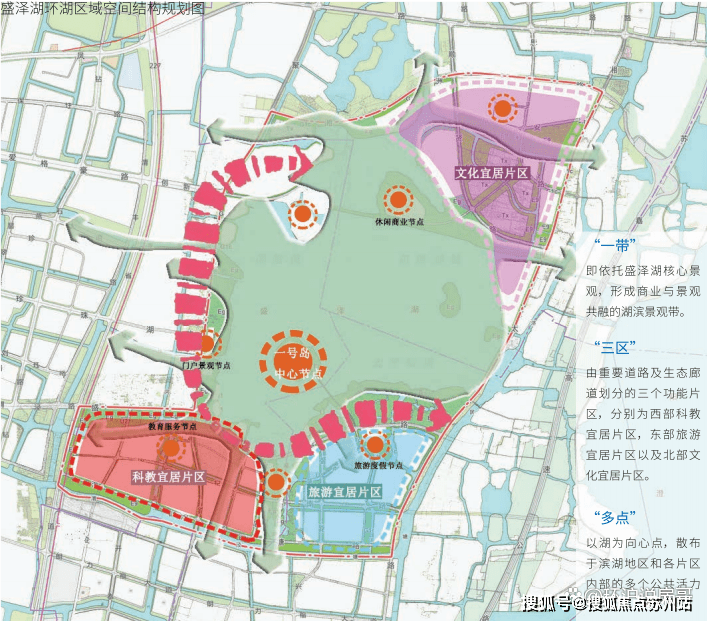 根据早些年的规划,盛泽湖环湖区域的功能定位为 “阳澄湖畔的5A级景区+现代都市型宜居住区”。在空间布局方面,这里将规划形成“一带、三区、多点”的空间布局结构, 南岸将形成两大宜居片区,打造空间精致、业态多元、交通完善的生态示范型综合配套区。