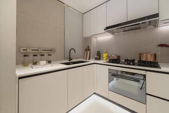 三开间朝南 的布局,保证充足光照。餐客厅一体化的设计,放大空间尺度感;U字型厨房,动线合理。