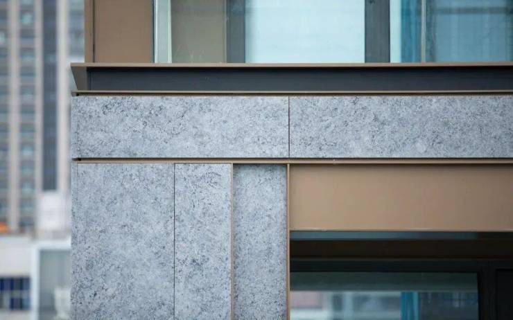 石材肌理的反复比对:进场石材不仅经过严格筛选,上墙后还会根据整体效果进行二次调整。