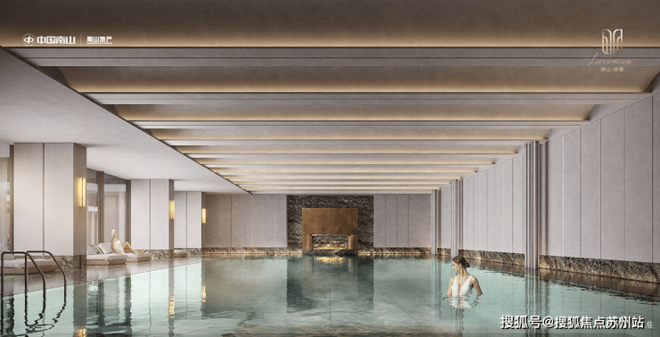 南山璞缦打造约1500m²恒温泳池会所,恒温泳池灵感源自卡地亚顶级珠宝系列海洋之心,整体空间非常高档,呈现出光影交错的画面感。