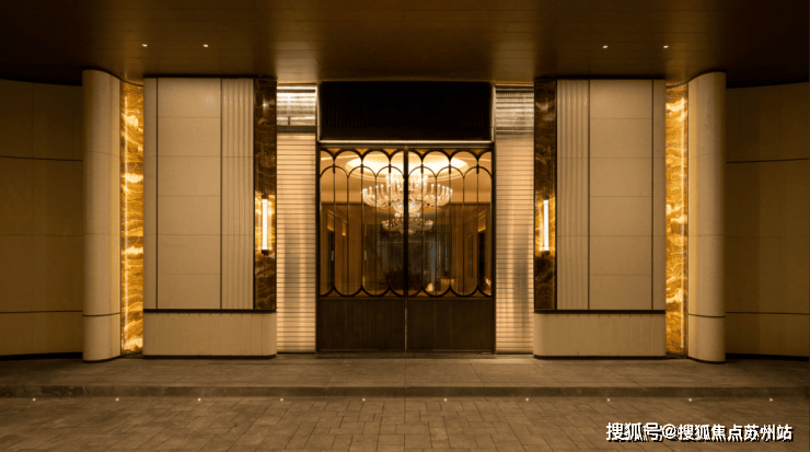 门庭延街的立面以 弧形米色石材+老虎玉大理石+古铜色艺术灯具构筑贵雅气质,环岛空间的奢石镶嵌与对称美学,再现百年海派风华。